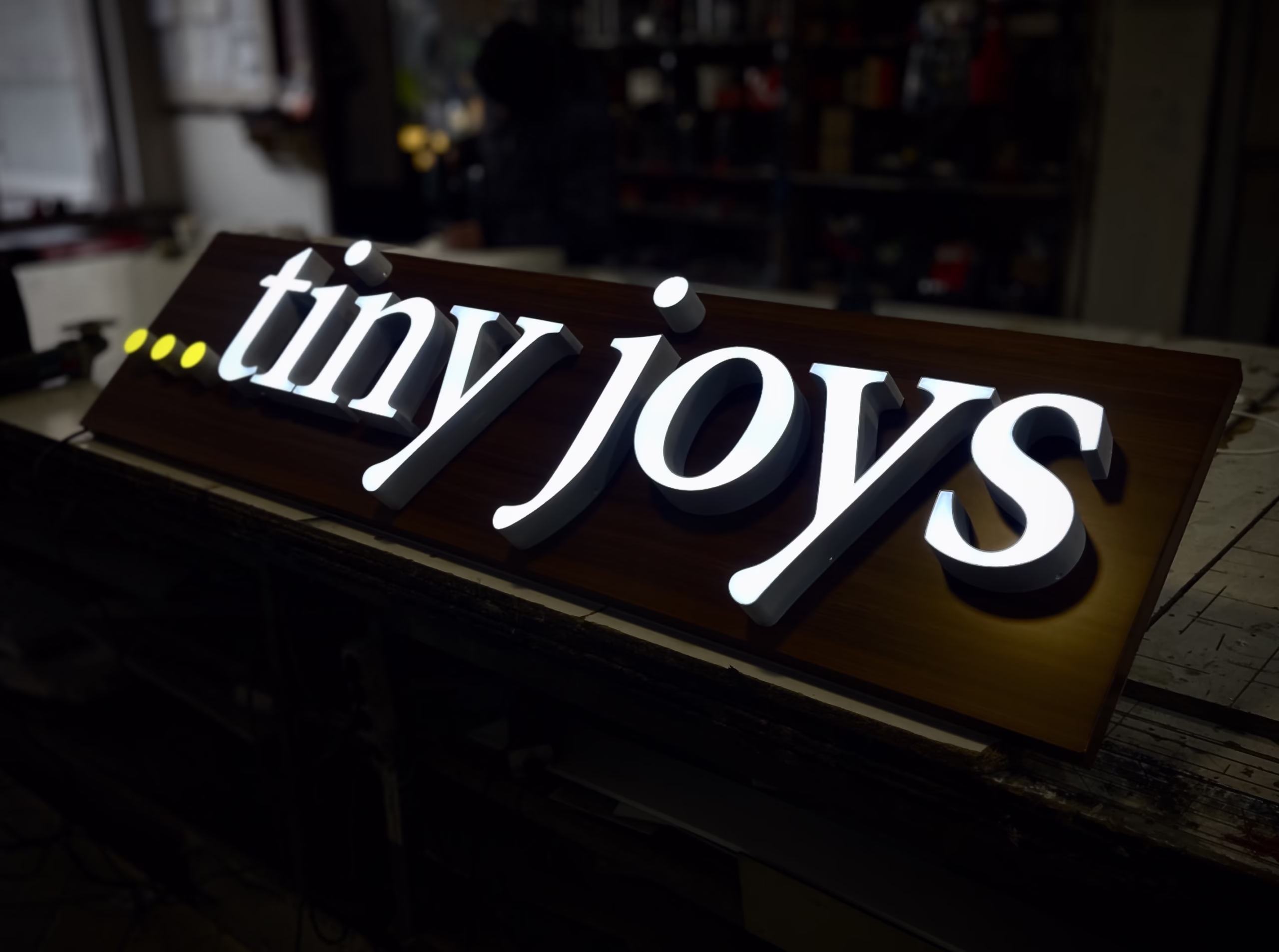 Tiny joys – 3D svjetleća slova 24. Januara 2026. Svjetleća reklama Tiny joys 3D svjetleća slova modela FRONTLIT WHITE montirana na alubond podlozi imitacija drveta. Bezvremenski dizajn koji privlači poglede i noću i danju, i ovu reklamu čini elegantnom i modernom.